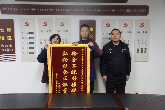 近日,紹興新昌縣七星派出所的民警帶著一面繡著“拾金不昧好榜樣,弘揚(yáng)社會(huì)正能量”的錦旗來到新昌技師學(xué)院七星校區(qū),將錦旗交到了學(xué)院21設(shè)計(jì)與制造班的梁子恒和李嘉成手中,并代表失主表達(dá)了誠(chéng)摯的感謝。