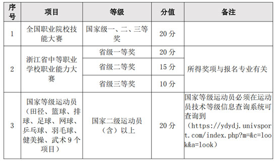 注:(1)考生填寫《義烏工商職業技術學院2023年素質特長評定申請表》(可在我校招生信息網站下載),憑個人高中階段所獲得的相關比賽獲獎證書,于4月1日-6日17:00通過我校提前招生管理系統申請。(2)獎狀獲得時間需在高中階段且在我校報名截止日期之前;素質特長評定最高不超過20分。