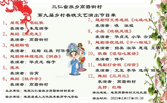 “太陽出來照四方,毛主席的話兒記心上......”2月17日,農歷正月廿八晚,一曲紅歌拉開了遂昌縣三仁畬族鄉高碧街村春晚文藝演出的序幕。癸卯新年,疫情消散,畬族山鄉群眾歡欣鼓舞,為表達對黨中央的擁護和熱愛,歌頌偉大的祖國、偉大的黨,遂昌縣成人文化技術學校組織群眾文化演唱團和高碧街村文藝愛好者精心排演,準備了豐富的節目;當晚,歌曲、舞蹈、小品、戲曲選段等輪番“上陣”,演出精彩紛呈,父老鄉親飽食“精神文化大餐”!