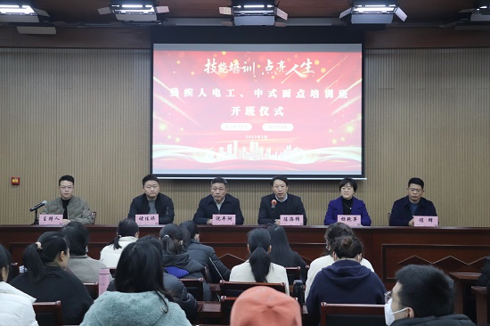 聚焦民生福祉,推動共同富裕。為增強殘疾人就業技能,進一步提高殘疾人群體就業率,3月4日,海寧技師學院與海寧市殘聯共同舉辦“殘疾人電工、中式面點培訓班”開班儀式。海寧市殘聯副理事長沈豐洲,海寧技師學院院黨委書記、院長陳海鋒,海寧市殘聯就業服務中心主任楊艷萍,海寧技師學院智能制造系主任褚佳琪、烹飪旅游系主任程鋒出席開班儀式。