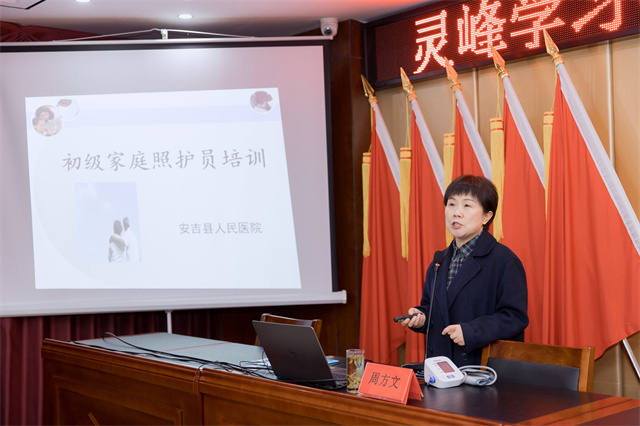 培訓由安吉縣人民醫院二級心理咨詢師周方文主講。周方文圍繞口腔清潔、體溫測量、血壓測量、幫助臥床老人翻身、排便等老年人基本護理的六大技能進行講解,講解過程中還邀請學員們上臺進行模擬訓練。學員們學得很認真。