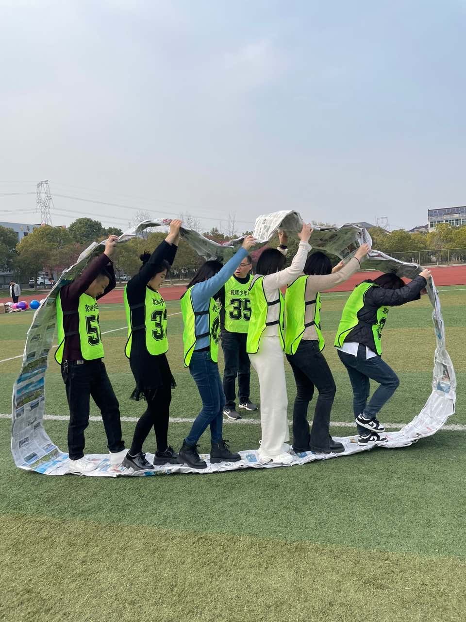 在“心往一處想,力往一處使”的“無敵風火輪”游戲中,每隊將報紙粘貼到一起,做成一個大紙圈,老師們充分發(fā)揮團隊合作精神制作穩(wěn)固的“風火輪",隨著“1、2、1、2”的口號聲,老師們努力邁向勝利的終點,體現(xiàn)了教師隊伍的良好協(xié)作。
