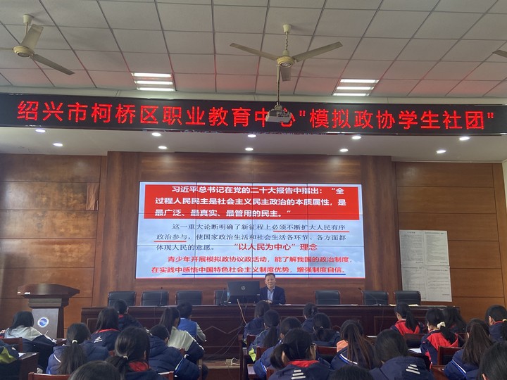 為進一步開展青年思想政治引領、深化青年制度自信教育,發揮學生社團育人功能,促進模擬政協學生社團規范化建立和發展。近日,紹興市柯橋區職業教育中心(高級技工學校)模擬政協學生社團開啟了第一堂課,由社團指導老師金海華老師擔任主講。金老師曾擔任柯橋區第一屆人大代表,人大常委會委員,現任柯橋區第二屆政協委員。
