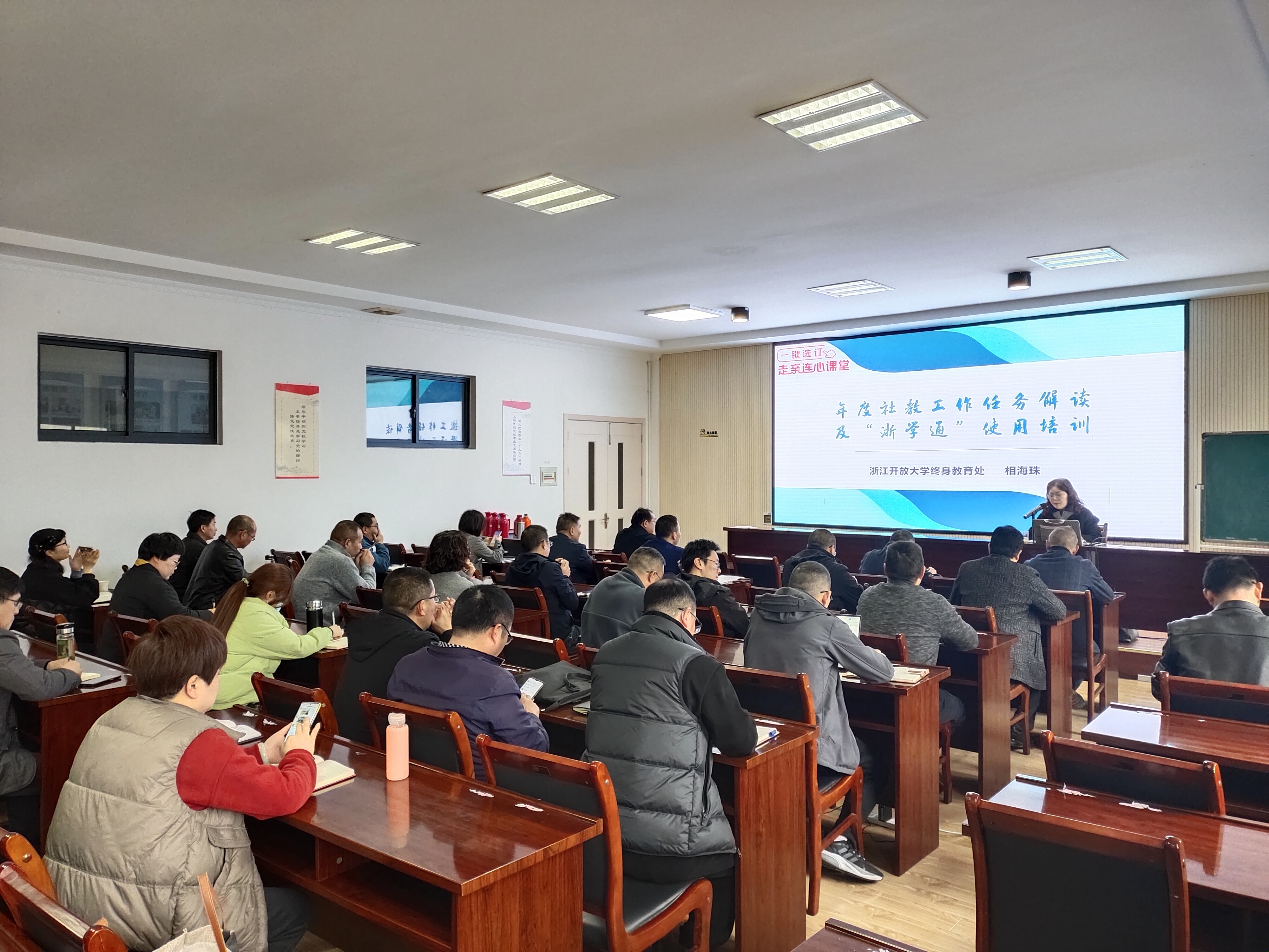 培訓班邀請了浙江開放大學終身教育處負責人相海珠作專題講座,內(nèi)容包括解析終身教育考核任務(wù)、布置年度社區(qū)教育工作和“浙學通”使用方法。