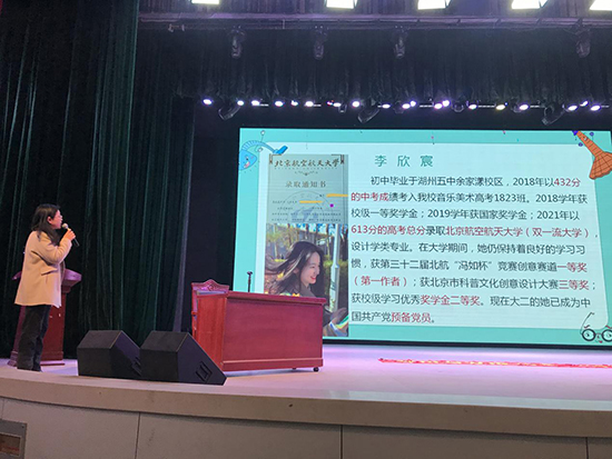 基礎(chǔ)專(zhuān)業(yè)部部長(zhǎng)裘艷主持并介紹了近幾年考上本科的優(yōu)秀畢業(yè)生。看著大屏幕上學(xué)姐學(xué)長(zhǎng)們一段段自信滿(mǎn)滿(mǎn)、青春洋溢的自我簡(jiǎn)介,高三學(xué)子心中燃起了對(duì)大學(xué)的無(wú)限憧憬。