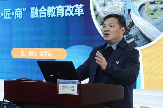 隨后,學校校長雷學遠做《基于“新混合所有制”的“禮·匠·商”融合教育改革》主題講座。他以新《職教法》為背景,聚焦中職教育的機制、平臺、目標三大問題,分享我校的主要做法和經驗啟示。