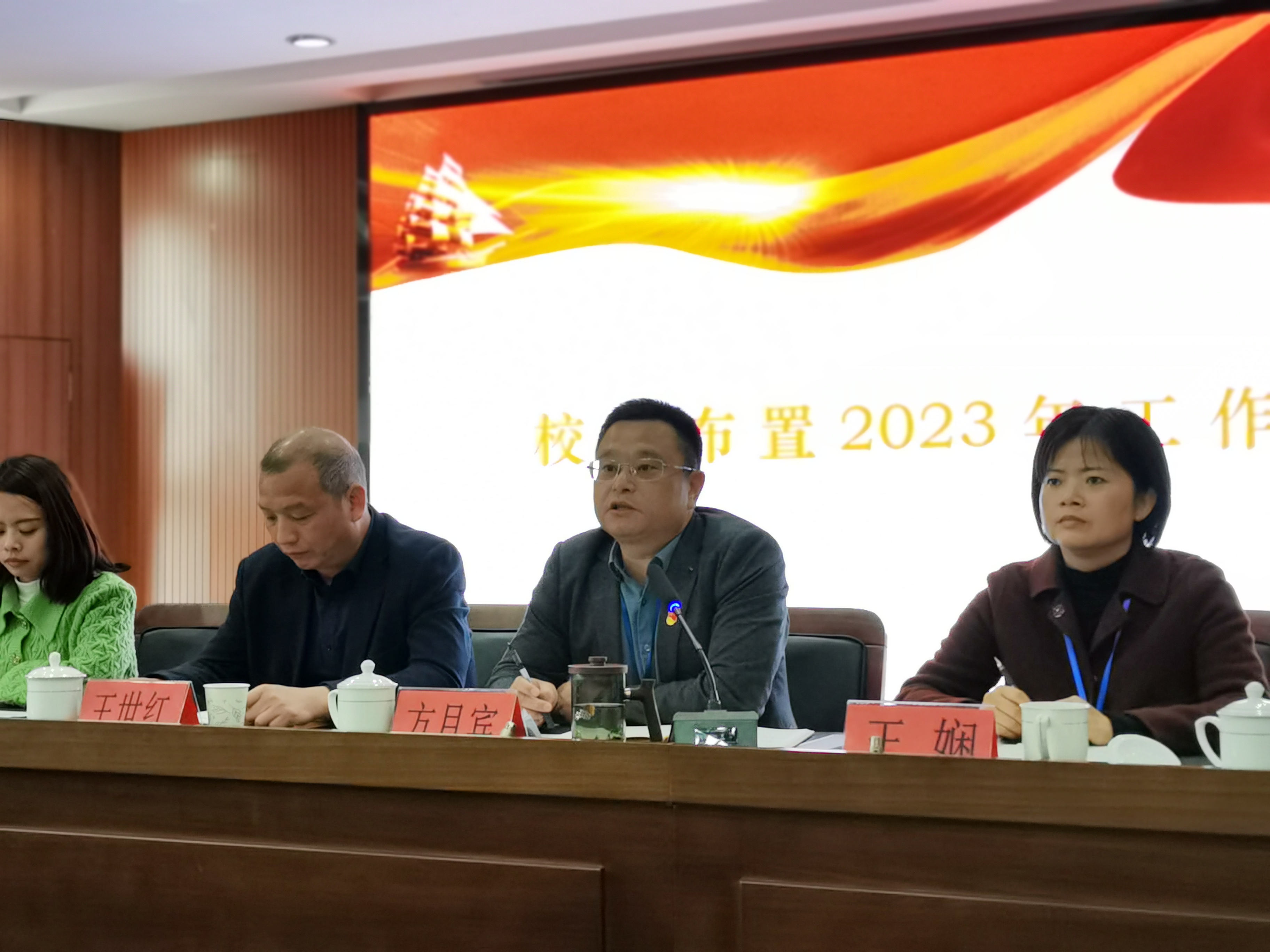 副校長趙燕、紀檢組長王嫻分別布置了安全和紀檢有關工作。隨后,方月賓對2022年度工作進行了總結,他肯定了2022年度全體教師在辦學水平、教育教學、隊伍建設、教科研工作、社會服務等方面取得的一系列成績與突破。與此同時,方校長立足現實,緊跟時代發展的潮流,把握中職教育教學的脈搏,對2023年度的工作進行了部署:一是要狠抓重點,以功成有我的決心投身學校建設發展。二是要聚焦關鍵,以功久必成的信心推動學校建設發展。三是要著眼全局,以功成于細的用心護航學校建設發展。方校長表示,學校會找準在衛生健康事業高質量發展、在區域經濟社會發展中的地位,以加大院校合作,探索區域產教融合體建設,加大“長學制”人才培養比例、優化辦學結構,以黨建引領深化學校清廉、平安建設,不斷強化學校綜合實力,希望全體教師繼續發揚團結、堅守、勇敢、奉獻的優良傳統,一起把學校建設成為“特色鮮明、質量上乘、省內一流”的高水平衛生職業學校!