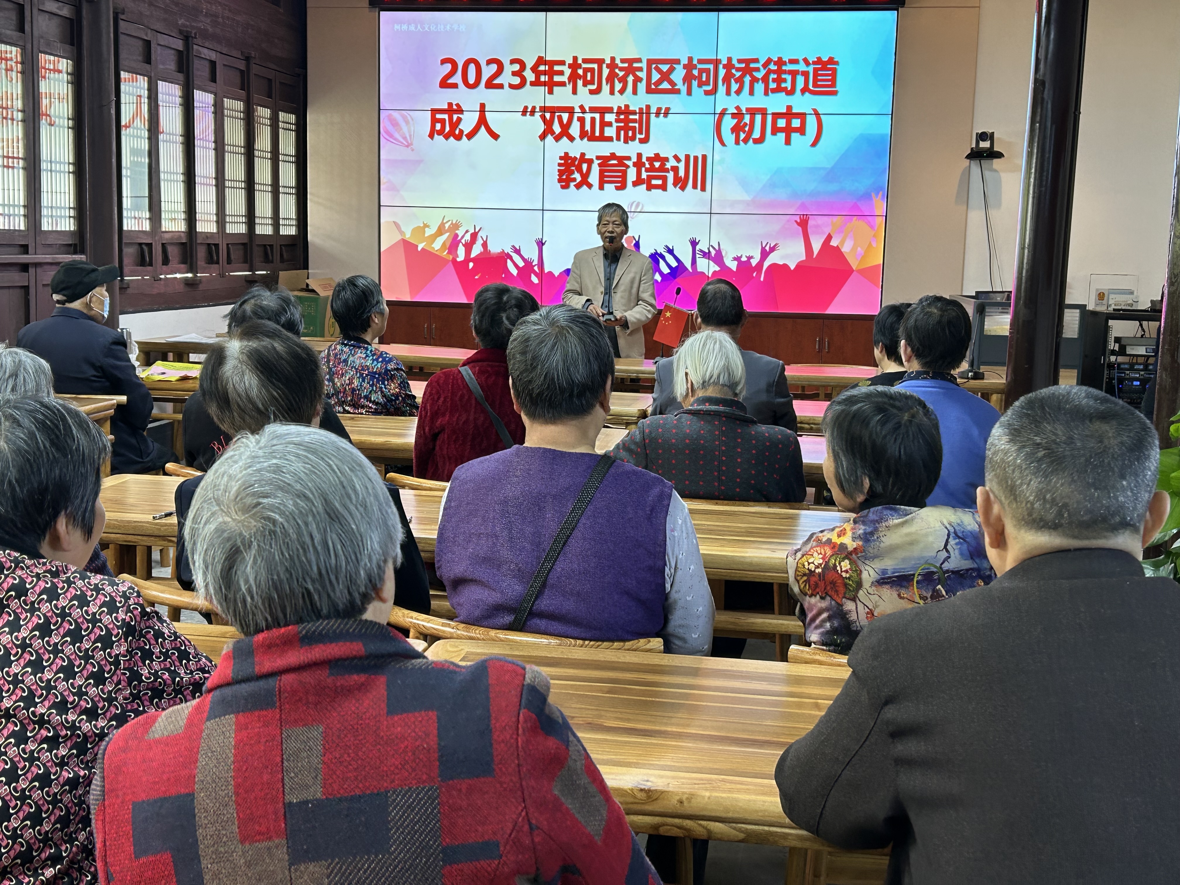 4月13日,一隊隊中老年市民手拿書本走進紹興柯橋區柯橋街道管墅社區文化禮堂。參加柯橋成人文化技術學校舉辦的2023年成人“雙證制”初中班的開學典禮。