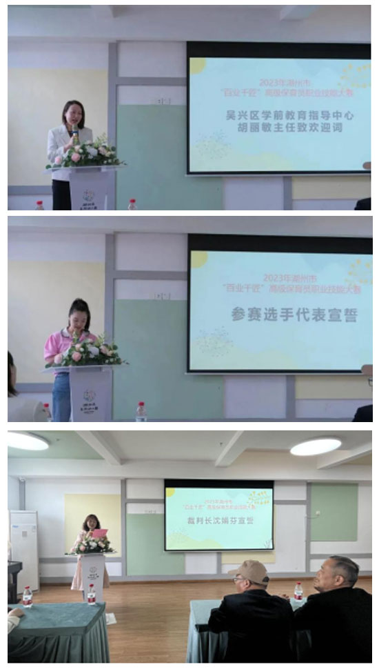 本次大賽的77名保育員參賽選手,均由全區(qū)各幼兒園擇優(yōu)推薦。大賽啟動儀式由吳興區(qū)教育局學前教育指導中心主任胡麗敏致歡迎詞,參賽選手代表宣誓,浙江省湖州藝術(shù)與設計學校沈娟芬老師作為裁判員代表宣誓。