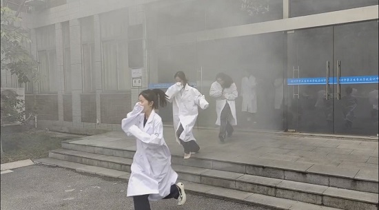 上午9時,實訓樓各個通道的煙霧逐漸彌漫開來,隨著一陣急促的哨聲響起,消防演練正式開始。在實訓樓授課的教師們帶領學生根據演練方案中規定的路線,沿著學校指定樓梯口快速疏散,有序撤離到學校操場的安全地帶。此次演練共用時2分40秒,整個過程緊張有序,達到了預期的效果。