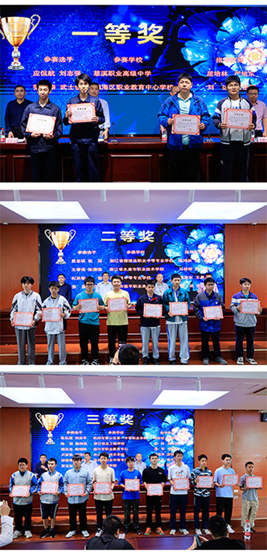 參賽選手們憑借扎實(shí)的理論功底和豐富的實(shí)操經(jīng)驗(yàn),展現(xiàn)出精湛的技術(shù)水平和良好的精神風(fēng)貌。經(jīng)過(guò)激烈角逐,慈溪職業(yè)高級(jí)中學(xué)、鎮(zhèn)海區(qū)職業(yè)教育中心學(xué)校選手獲一等獎(jiǎng);浙江省德清縣職業(yè)中等專業(yè)學(xué)校、浙江省永康市職業(yè)技術(shù)學(xué)校、嘉善縣中等專業(yè)學(xué)校、杭州市臨平職業(yè)高級(jí)中學(xué)選手獲二等獎(jiǎng);杭州市蕭山區(qū)第一中等職業(yè)學(xué)校、浙江信息工程學(xué)校、紹興市職業(yè)教育中心、舟山職業(yè)技術(shù)學(xué)校、溫州市職業(yè)中等專業(yè)學(xué)校、嘉興技師學(xué)院選手獲三等獎(jiǎng)。浙江機(jī)電職業(yè)技術(shù)學(xué)院繼續(xù)教育學(xué)院原院長(zhǎng)倪志明教授,德清職業(yè)中專黨委副書(shū)記、副校長(zhǎng)(全面負(fù)責(zé))王法松等協(xié)辦方領(lǐng)導(dǎo)出席閉幕式并為獲獎(jiǎng)選手頒獎(jiǎng)。