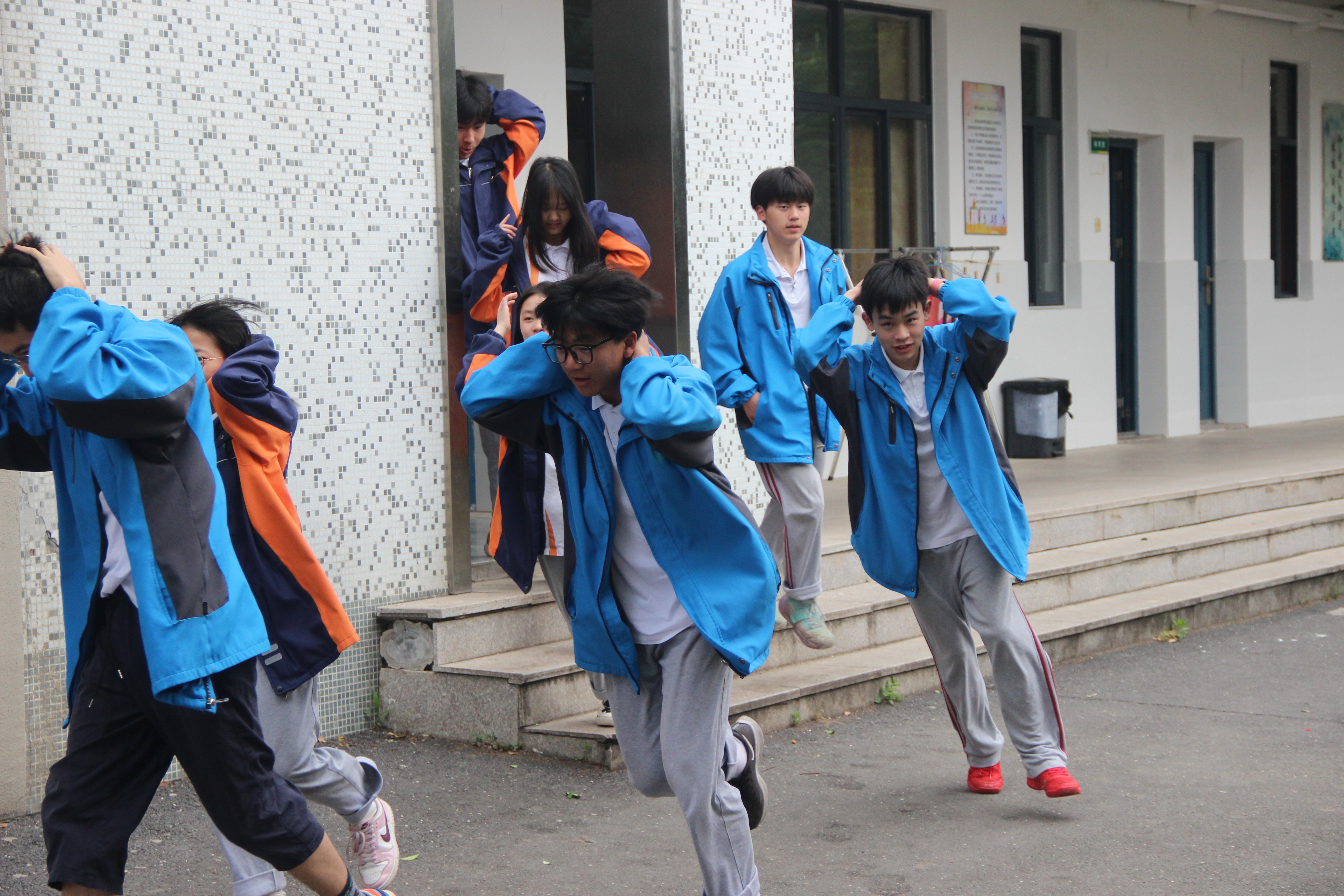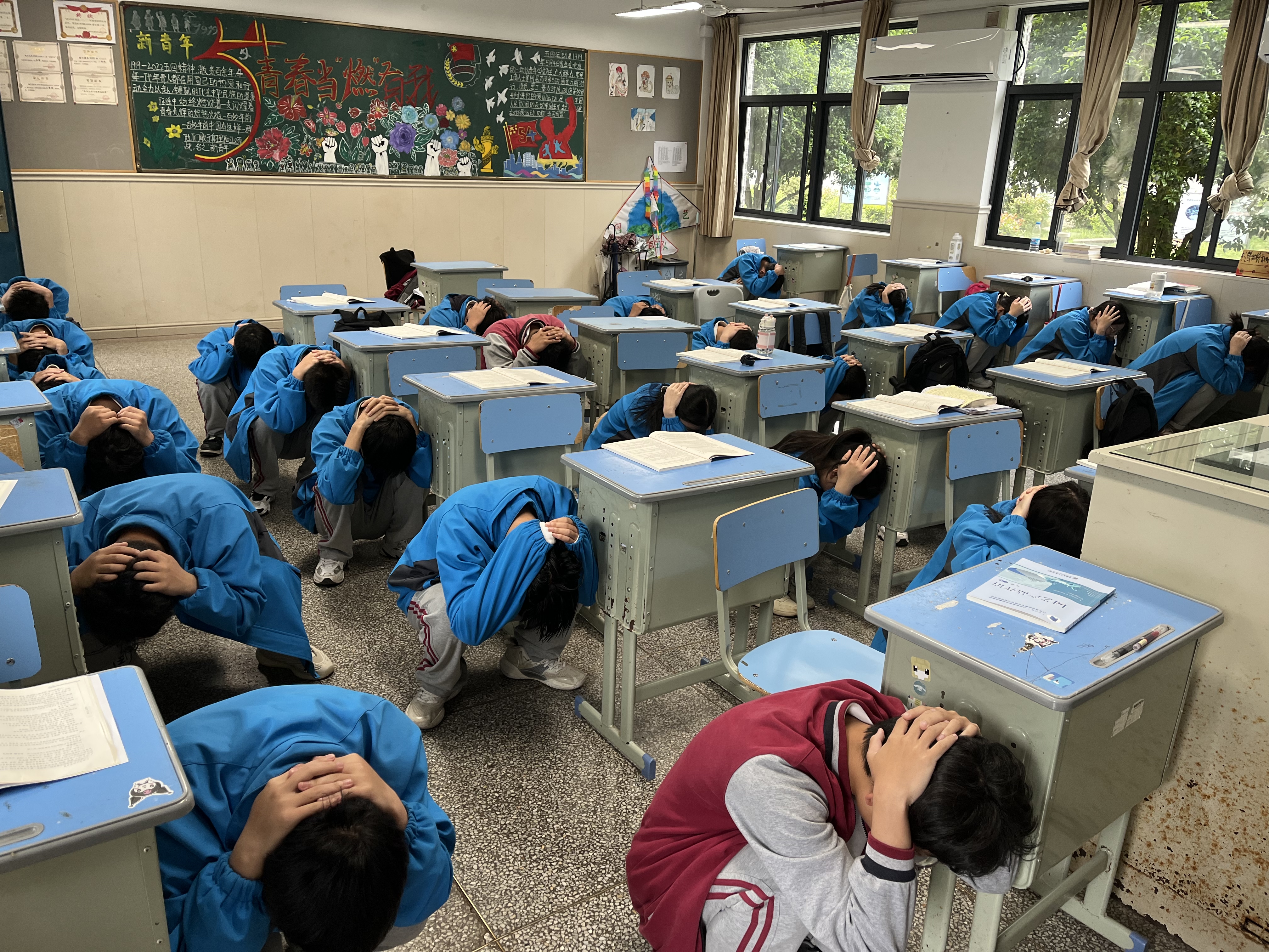 第一次警報聲響起后,教師組織學生迅速抱頭或頭頂書包等就近躲避,身體采用臥倒或蹲下的方式,使身體盡量低,躲到桌邊或墻角,以保護身體,避免被砸。