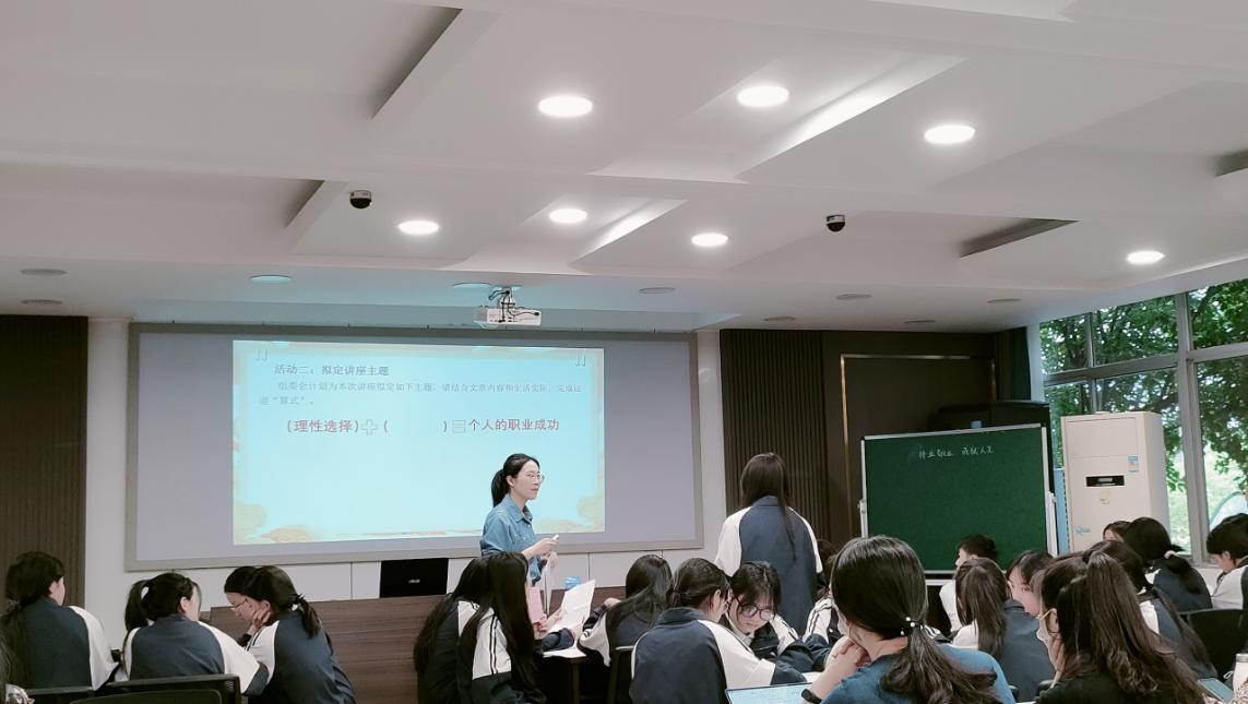 青田職技校徐秋雋老師執(zhí)教《擇業(yè)敬業(yè) 成就人生》一課,她以學校為高二學生籌劃開展一場職業(yè)規(guī)劃指導講座,組委會現(xiàn)向全校同學征集講座建議和創(chuàng)意。”為情境,以推選選作材料,擬定講座主題,邀請講座嘉賓,征集職業(yè)規(guī)劃系列活動,逐層深入地引導學生對比閱讀兩篇選文主要內(nèi)容與語言風格的不同之處?;趦晌牡墓残裕炖蠋熞龑W生深入探究個人職業(yè)成功的要素,擬定個人職業(yè)發(fā)展規(guī)劃。