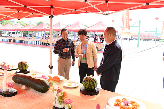 這是活動當天,在通往操場的學校廣場上,金華實驗中學師生特意為遠道而來的朋友們準備的一份“禮物”——專業作品展。“這個書簽售賣嗎?”“這個刺繡圖是你們自己設計的?”大家被手繪團扇、電子機械類作品、純天然手工皂、中餐擺臺、西瓜雕、文創產品等精巧別致的作品吸引,紛紛駐足欣賞,不時拿起手機拍照留念,豎起大拇指點贊學生的作品新穎、精致,夸贊學生們專業技術好。