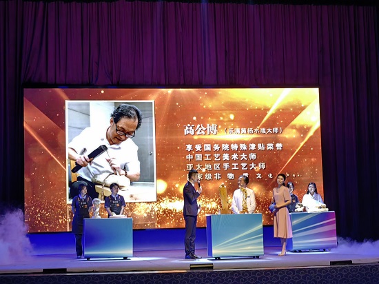 高公博大師上臺接受了主持人的采訪,娓娓道來樂清黃楊木雕的歷史,解讀了中國四大木雕的不同之處,著重強調了黃楊木雕創作過程中始終應保持“新奇獨變”的態度,即學生應保持新的觀念、奇妙造型、獨立個性、不斷變化等,充分發揮主觀能動性,提高學習的興趣,增強思維能量,不斷地把樂清古老的文化推向更高的層次。高公博大師的徒弟、樂清職專畢業生仇夢琦也生動解析了所展示的木雕作品的深意,以及學習黃楊木雕藝術所帶來的成長與啟發。