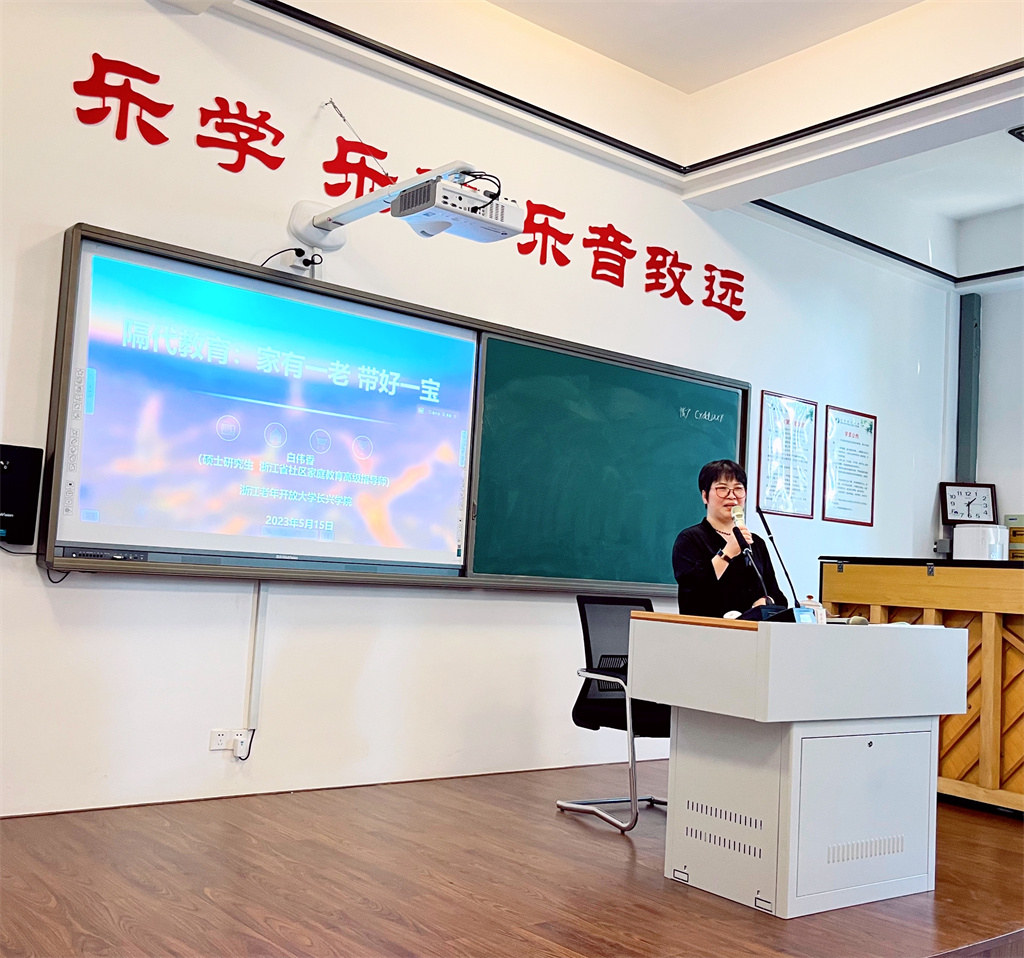 5月15日,在第30個“國際家庭日”來臨之際,浙江老年開放大學長興學院開展了“隔代教育:家有一老 帶好一寶”主題活動,30多名老年學員自主報名參加。學院教師、省社區(qū)家庭教育高級指導師白偉香做了專題講座。