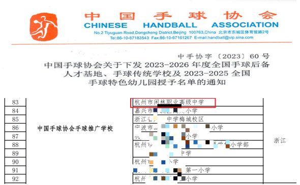 近日,中國(guó)手球協(xié)會(huì)官方網(wǎng)站公布了《2023-2026年度全國(guó)手球后備人才基地、手球傳統(tǒng)學(xué)校及2023-2025全國(guó)手球特色幼兒園授予名單》,閑林職高成為浙江省唯一一所入圍的中職學(xué)校。
