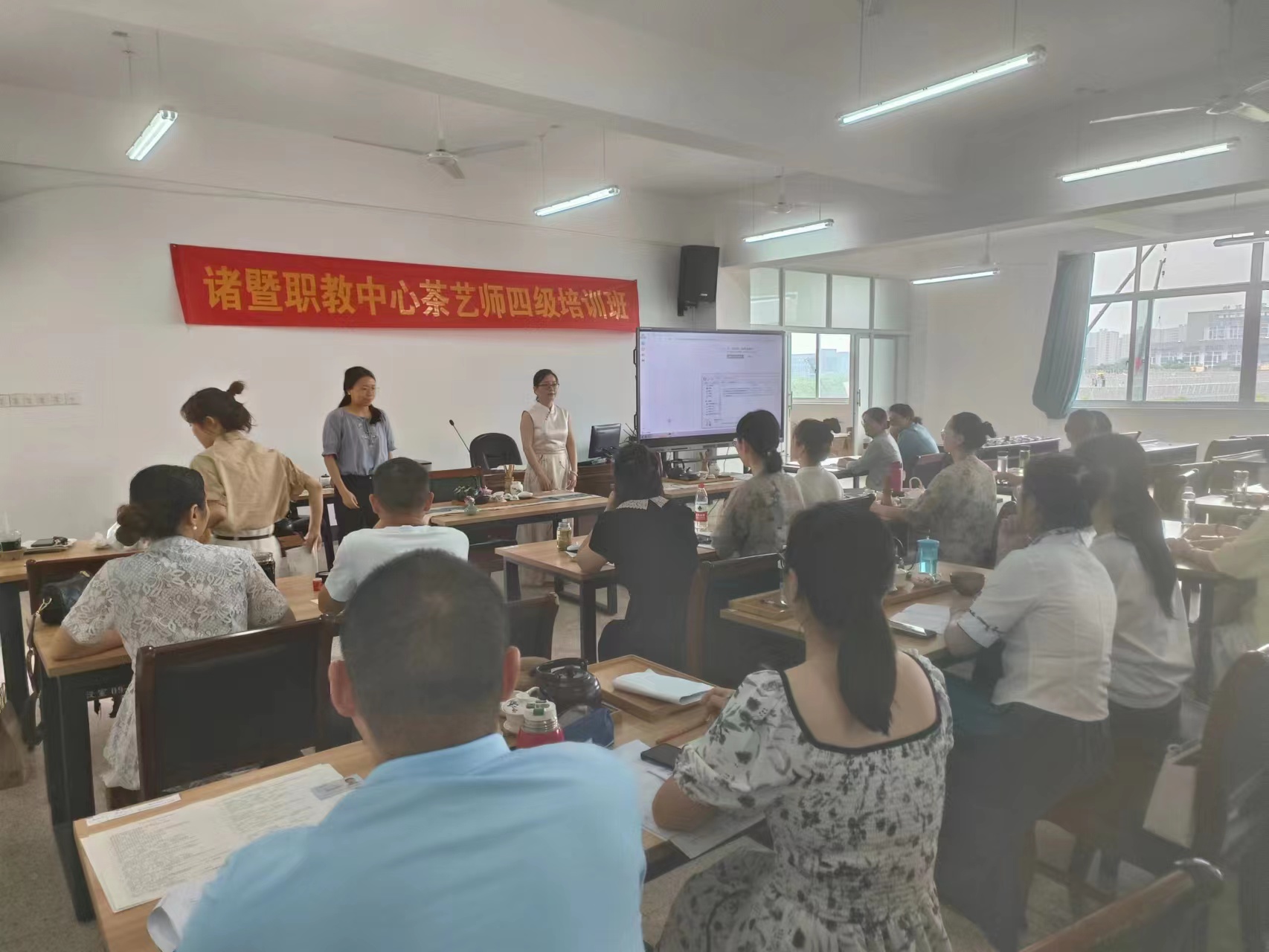 5月21日,在諸暨職教中心“越匠樓”,兩個“育嬰師(高級)”培訓班和一個“茶藝師(中級)”認定考核班正在緊張有序地開展。