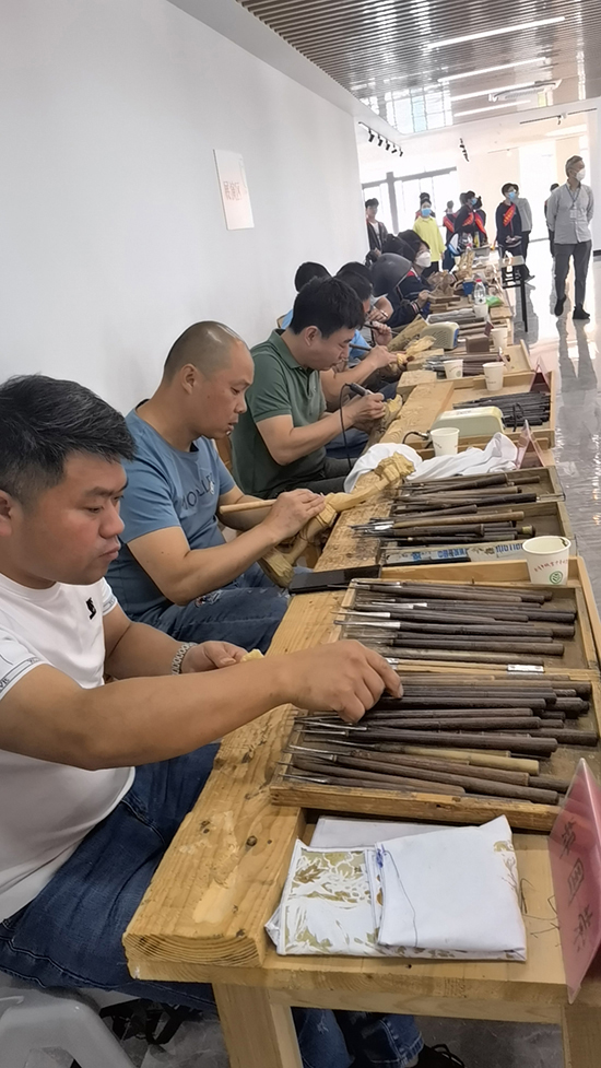 5月26日上午,在明德樓高軒敞亮的大廳,現(xiàn)場創(chuàng)作活動(dòng)開始。創(chuàng)作大廳設(shè)有雕刻區(qū)、非雕刻區(qū)、展演區(qū)。在這個(gè)難得的彰顯個(gè)人才藝的舞臺(tái),95名選手開始了一天半的高強(qiáng)度創(chuàng)作。溫州市非遺樂清細(xì)紋刻制傳承人代表金伍娒、二十多名指導(dǎo)教師代表也在展演區(qū)獻(xiàn)藝。各類紛繁的非遺技藝在千年的藝術(shù)時(shí)空里薪火相傳。