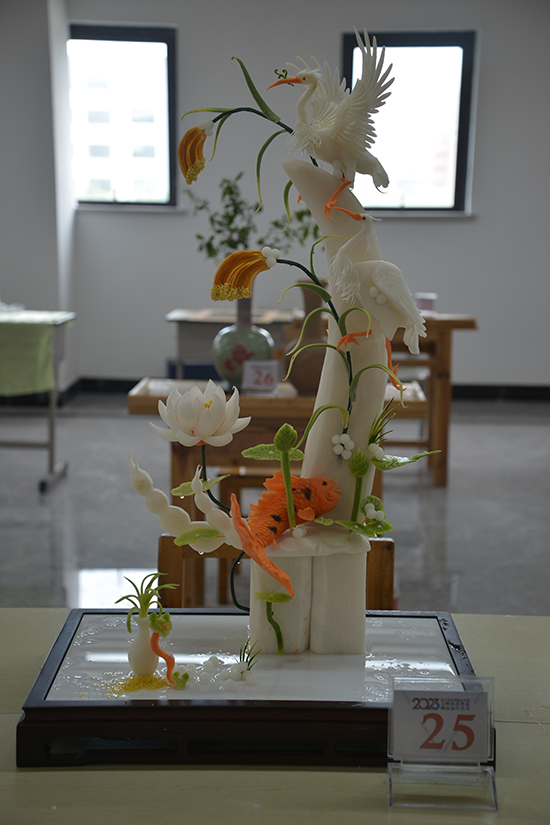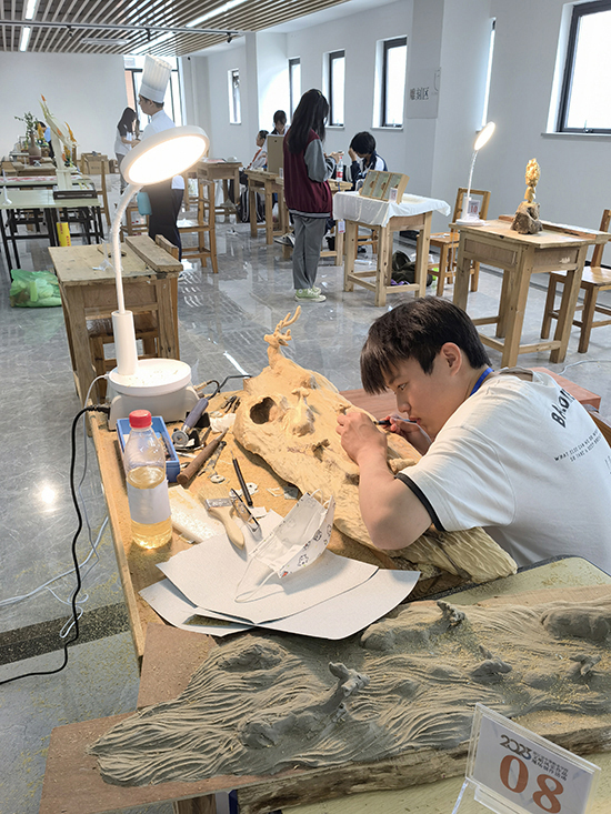 在紛飛的木屑中,在砰砰砰的斫木聲中、在稍顯嘈雜的電鉆聲中,選手們沉浸在自己的創(chuàng)作天地里。這些作品的設(shè)計(jì)不拘一格,《綠嶼》是一件看著有點(diǎn)“奇怪”的立體造型作品,指導(dǎo)教師介紹道,造型是一切手工創(chuàng)作的基礎(chǔ)能力,作品摻合了非遺的文化元素,富有現(xiàn)代創(chuàng)意和手段;木刻版畫《匠心鑄就夢想 技能點(diǎn)亮人心》氣勢恢宏,大幅的紅色隱喻著“紅船精神”;果蔬雕刻《食鯉傳福》精美絕倫,雕工、色彩、造型已是多年老師傅的水平了,作品主題也傳達(dá)出滿滿的傳統(tǒng)味;蠟染《水鄉(xiāng)情》是一副大制作,四米長的寬幅,每一道制作程序都有嚴(yán)格的時(shí)間規(guī)定,三位選手嫻熟地操作著。青瓷雕刻《一盤一碟千峰奪翠》、鋁藝作品《亞運(yùn)憶江南》等等,太多天馬行空而又透著民族傳統(tǒng)韻味的作品了。非遺技藝的傳承使得原本遙不可及的傳統(tǒng)民間藝術(shù)在學(xué)生指尖下熠熠生輝,煥發(fā)出嶄新的生命力、創(chuàng)造力,煥發(fā)出現(xiàn)代生活和青春的氣息。