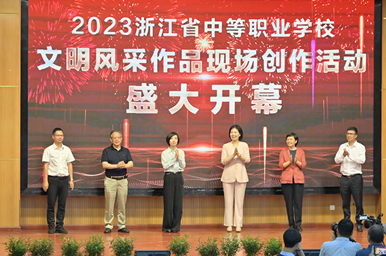 最后,六位嘉賓站在大屏幕前,在歡快激揚(yáng)的音樂聲中,屏幕出現(xiàn)5—4—3—2—1倒計(jì)時(shí),在煙花四濺的最后一瞬間,齊齊按下大手印,宣告浙江省中等職業(yè)學(xué)校文明風(fēng)采作品現(xiàn)場創(chuàng)作活動(dòng)的開啟。
