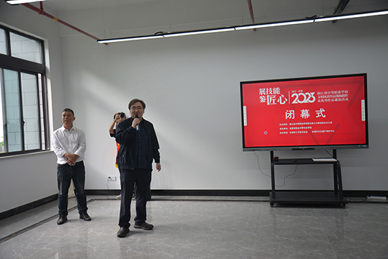 5月27日下午,近兩天高強(qiáng)度的現(xiàn)場創(chuàng)作圓滿結(jié)束了,閉幕式如期舉行。浙江省教育廳職成教處崔陵主任發(fā)表講話,他說,這是省中等職業(yè)學(xué)校文明風(fēng)采作品比賽第一次采用現(xiàn)場創(chuàng)作的模式。這種模式確保了參賽作品確切出自學(xué)生之手。這種遴選模式的背后是組委會(huì)和承辦單位的巨大付出。這種比賽,專家全程參與,既是評(píng)審也是指導(dǎo),符合“五育”并舉的原則,在藝術(shù)作品創(chuàng)作中切實(shí)推動(dòng)文化育人、活動(dòng)育人、實(shí)踐育人。