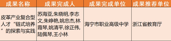 5月21日,教育部公示2022年職業(yè)教育國家級教學(xué)成果獎擬授獎成果的名單結(jié)束,海寧市職業(yè)高級中學(xué)成果《皮革產(chǎn)業(yè)復(fù)合型人才“鏈?zhǔn)脚囵B(yǎng)”的探索與實踐》榮獲2022年職業(yè)教育國家級教學(xué)成果獎二等獎!也是學(xué)校第二次獲得國家級教學(xué)成果獎二等獎!