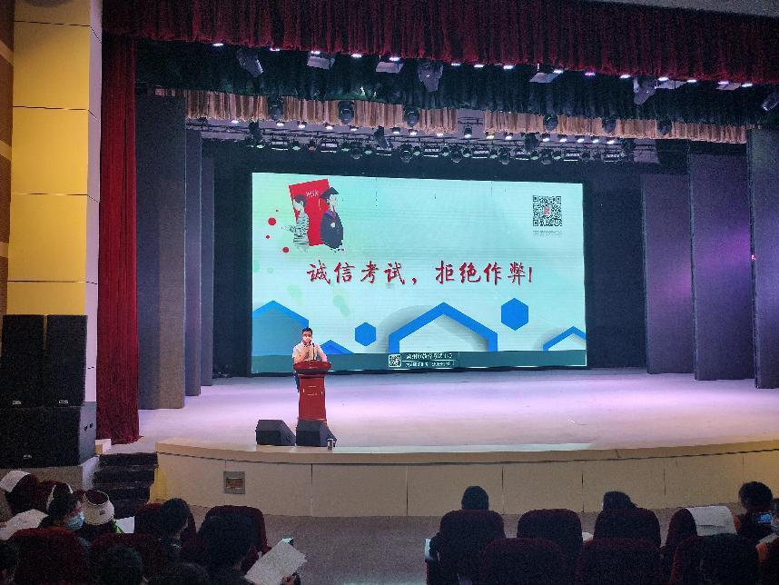 教務(wù)處朱小平老師從真實(shí)的誠信故事展開宣講,論述誠信對(duì)于個(gè)人成長的重要意義。他結(jié)合多年考務(wù)工作實(shí)際,突出介紹考試中經(jīng)常出現(xiàn)失誤,進(jìn)而可能影響誠信考試問題的案例,比如:帶入有存儲(chǔ)功能的電子設(shè)備、提前答題等。同時(shí),他重點(diǎn)強(qiáng)調(diào):今年突出的變化是手機(jī)等電子設(shè)備的二次安檢,辨析了違規(guī)、違紀(jì)等概念,再認(rèn)知了這些行為可能會(huì)承擔(dān)的嚴(yán)重后果等。