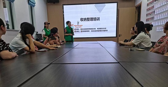 安吉姐妹家政的劉小萍老師為學員們帶來收納整理第一課,劉老師從收納與收拾的角度,帶領學員迅速進入收納整理的認識理解,同時結合一個個生活實例,詳細列舉家庭收納的誤區及改進方法,為使學員們學以致用,劉老師還手把手地帶領大家練習,通俗易懂、生動幽默的講解得到了學員們的一致好評,課堂氣氛十分活躍。(易戰)