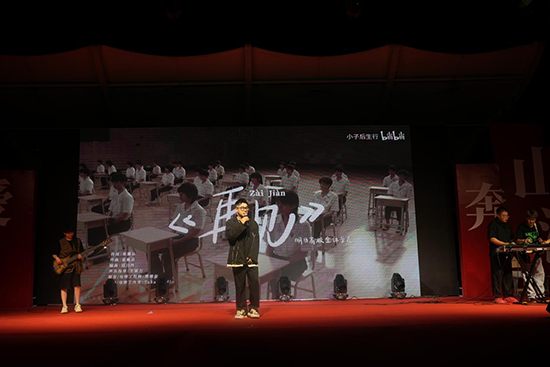 班主任代表吳佳林老師和卜婧婧老師驚喜地從學(xué)生叢中走向舞臺,一首《鳳凰花開的路口》送給全場畢業(yè)生。