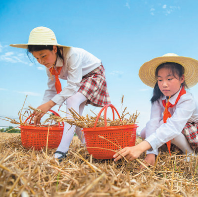 江蘇省海安高新區(qū)實(shí)驗(yàn)小學(xué)開展“熱愛(ài)勞動(dòng) 珍惜糧食”教育活動(dòng),少先隊(duì)員在麥田里撿拾散落的麥穗。