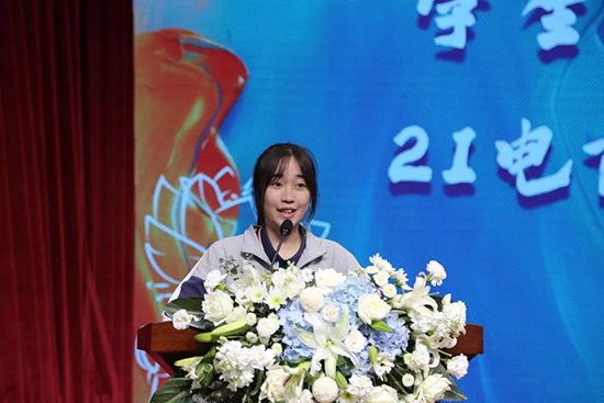 信息服務學院21電商3班周紅婷作為學生代表發言。她代表學生對家長、學校、老師和企業表示感謝。他們會牢記老師和父母的教誨,以認真積極的態度對待工作任務,聽從企業安排和指導,努力學習知識、提升技藝。做好學生到員工的轉換,把握企業提供的崗位機會,虛心向師傅學習,在實際工作中迅速成長為合格員工。