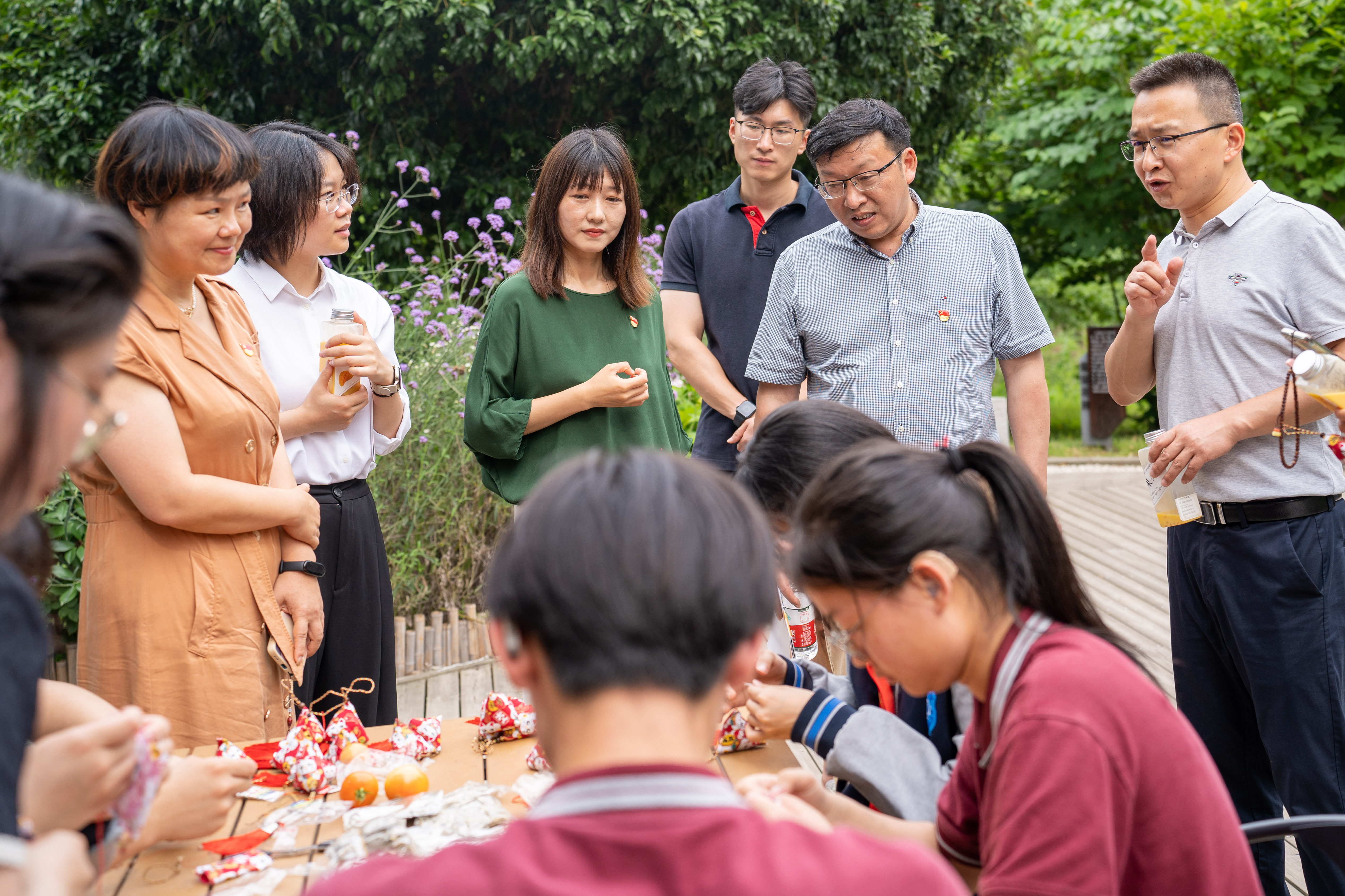 曾處長一行在學校黨委副書記、副校長張建霞和黨委委員、副校長湯方榮的陪同下,走進職業與心理發展中心。行政二黨支部書記陸婷老師為大家介紹了學校的心理中心各個功能室和室外園藝心理中心,并詳細介紹支部“心育共富”特色品牌的由來與品牌輻射作用。大家駐足觀看由教育康復學校韋老師給學校新團員帶來的手語課堂,體驗了AI情緒宣泄交互系統、智能身心放松系統等心理設備,在園藝心理中心感受了大自然帶給人類在嗅覺、味覺、聽覺、視覺、意覺等多感官上的饋贈。心靈花園中,支部宣傳委員楊育萍老師正帶著青春健康同伴社同學和教育康復學校的學生制作端午香囊;冥想區內,專職心理教師管惠瑜正帶著同學們進行冥想體驗…… 黨員教師們通過心育形式促進青少年精神共富滿懷熱忱,并充分付諸工作實踐。