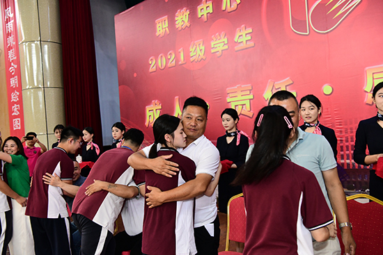 隨后,在周一妹老師的領誓下,全體高二學生面對國旗,莊嚴宣誓。在感恩父母環(huán)節(jié),學生代表上臺向父母行鞠躬禮,獻感恩茶。在這個特殊的時刻,讓同學們感恩父母,感謝家長賦予孩子生命,感謝家長撫育孩子成長。老師是園丁,育得桃李芬芳;學生是花朵,在精心澆灌下茁壯成長。站在成人的門檻上,班主任老師們又送來了成人寄語。朝夕相伴了兩年,一束鮮花,一個擁抱,一切盡在不言中。21電商1班王婷婷作為學生代表發(fā)表成人心聲,她感謝兩年來父母、老師、同學、學校給予的支持與愛,在未來的日子,自己將懷揣著夢想,緊握著希望,挺起堅實的胸膛,昂首面對已經(jīng)成年的自己,在未來的人生之路上,披荊斬棘,挑戰(zhàn)極限。21計4鐘凱怡父親鐘正平作為家長代表上臺發(fā)言,他希望每一位同學要學會獨立思考世界、感受生活、實踐目標,同時學會如何愛護自己、尊重他人、遵守社會公德,并且學會帶著感恩和欣賞的眼睛來發(fā)現(xiàn)這個世界的美好。孫良杰代表學校深情寄語。孫校長希望全體高二學生在以后的人生道路上,多掌握生存的技能、多學習生活的知識、多理解生命的意義,在青春時用腳步丈量世界,用眼睛發(fā)現(xiàn)美好,用耳朵傾聽呼聲,用內(nèi)心感應變化,把對家國血濃于水、與時代同呼吸共命運的情感貫穿學業(yè)全過程、融匯在事業(yè)追求中。