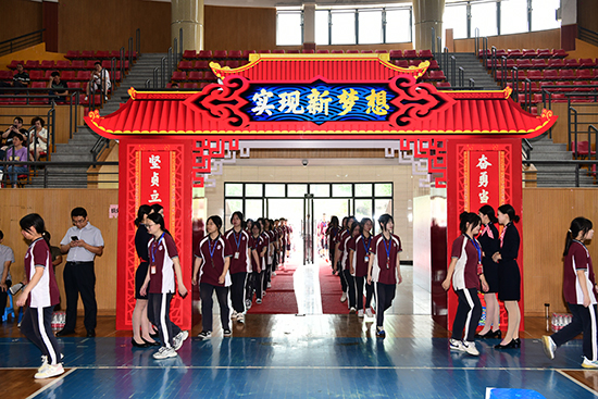 楊藝超宣布2021級學生成人門儀式正式開始,在背景音樂中,同學們排著整齊的隊伍緩緩入場。同學們和班主任手挽手,一起邁著堅實的步伐,從寫著“邁入成人門,實現(xiàn)新夢想”的巨大成人門下走過,象征著同學們跨過十八歲的門檻,即將成長為有責任感、有感恩心、有奉獻精神的新公民。
