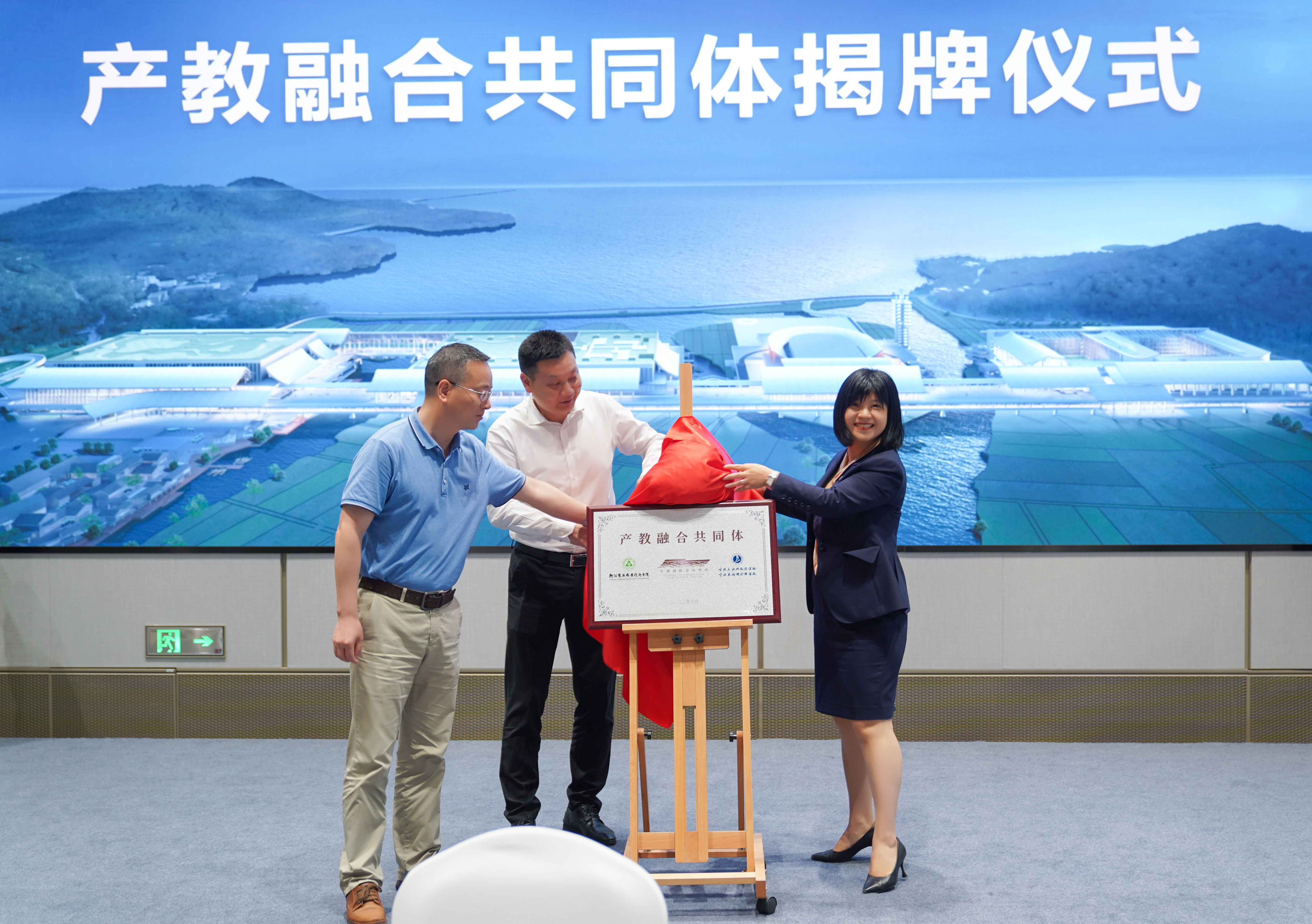 浙江育英職業技術學院副校長徐曉斌、寧波東錢湖旅游學校校長楊海如、寧波國際會議中心管理有限公司執行董事兼總經理程嘉共同為中高企產教融合共同體揭牌。