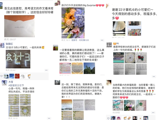 “最初的我們懷著一顆充滿期待的心來到學校,是您用慈愛的話語、和藹的笑容溫暖了我們的心......”這是21幼教1班的學生寫給她們班主任胡老師的手寫信里面的一句話。不僅胡老師,學校的79位班主任都收到了這樣的告白“情書”。一封封書信,紙短情長,言淺情深,無不記錄著班主任的每一份愛與付出,無不傾訴著學生的深深感激與感動。