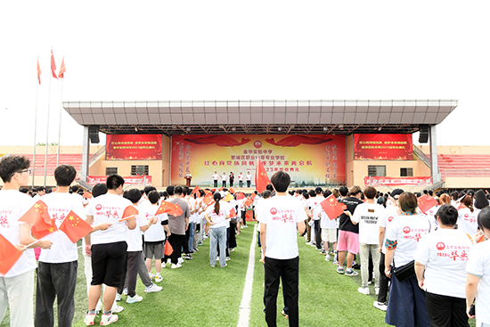 “沒有共產黨就沒有新中國……”大家揮舞著五星紅旗,齊唱《沒有共產黨就沒有新中國》,在歡快的歌聲中,拉開了畢業典禮的帷幕。