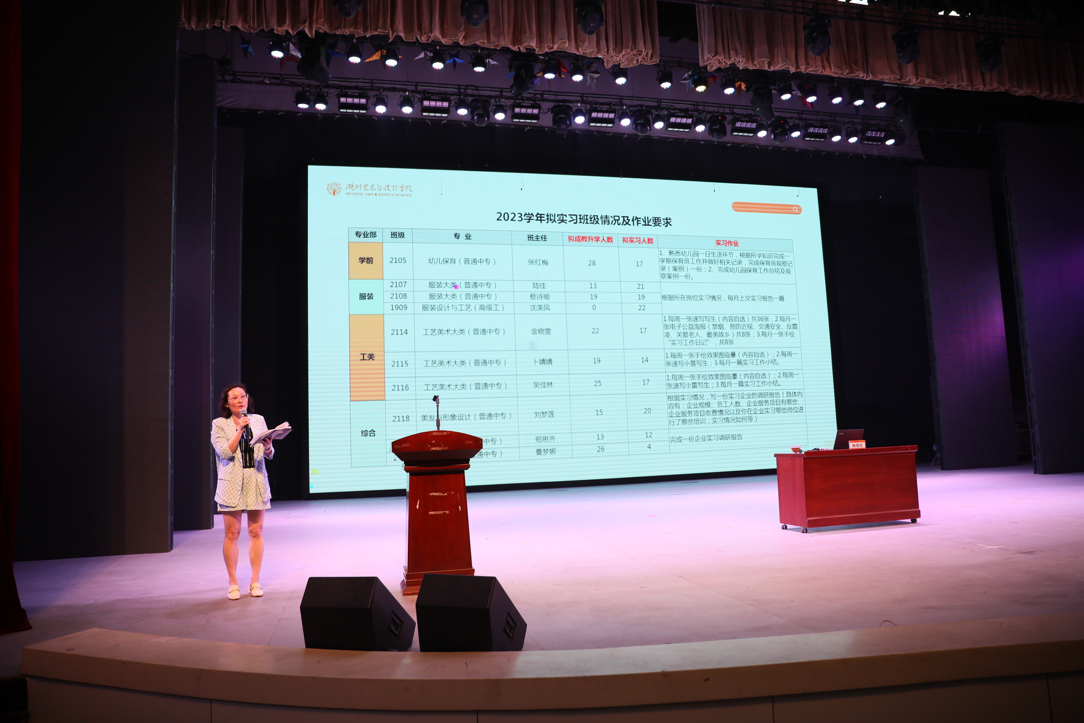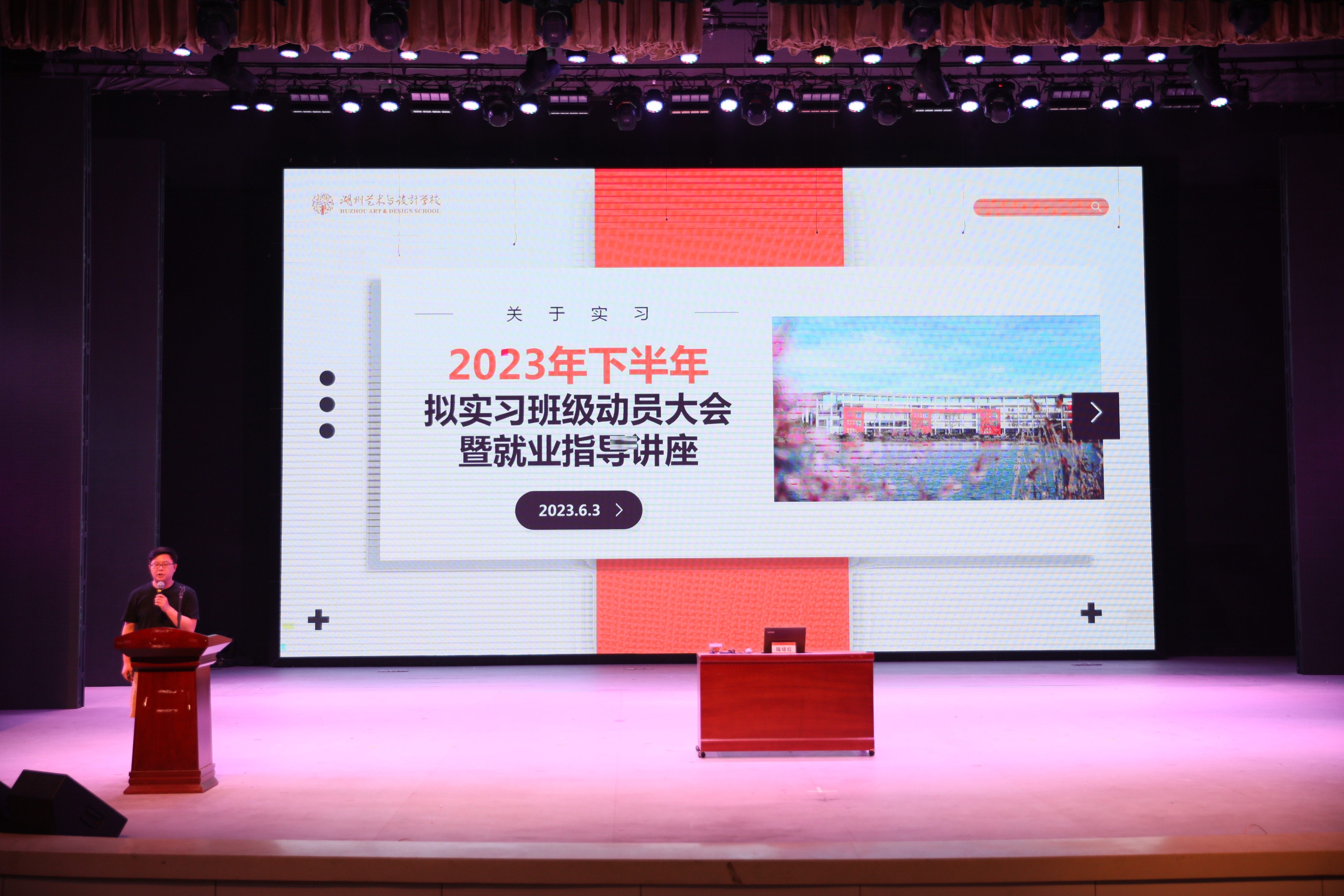 為做好2023屆畢業生實習指導工作,讓學生明確實習的目的、意義,引導學生做好實習準備,6月3日,浙江省湖州藝術與設計學校在星海演出廳召開2023年下半年擬實習班級動員大會暨就業指導講座。此次會議由招生就業處副處長李平主持,教務處處長錢國妹做實習作業布置。會議還邀請湖州市人力資源和社會保障局就業促進與失業保險處副處長陸培紅作就業指導講座。