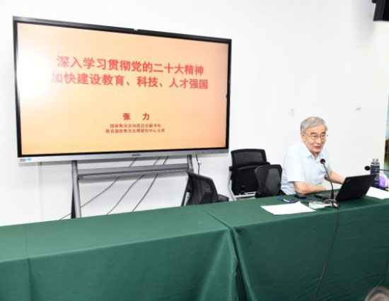 國家教育咨詢委員會秘書長、教育部原教育發(fā)展研究中心主任張力“深入學習貫徹黨的二十大精神,加快建設(shè)教育、科技、人才強國”的主題報告,從“兩個一百年”奮斗目標宏偉藍圖出發(fā),圍繞黨的二十大報告關(guān)于“教育、科技、人才是全面建設(shè)社會主義現(xiàn)代化國家的基礎(chǔ)性、戰(zhàn)略性支撐”等內(nèi)容以及習近平總書記關(guān)于教育的重要論述,從數(shù)據(jù)和政策兩個層面,詳細解讀全面建設(shè)社會主義現(xiàn)代化國家,教育是基礎(chǔ),科技是關(guān)鍵,人才是根本的深刻內(nèi)涵,讓大家對中國式現(xiàn)代化、職業(yè)教育工作、教師隊伍建設(shè)等內(nèi)容有了更深的領(lǐng)悟。