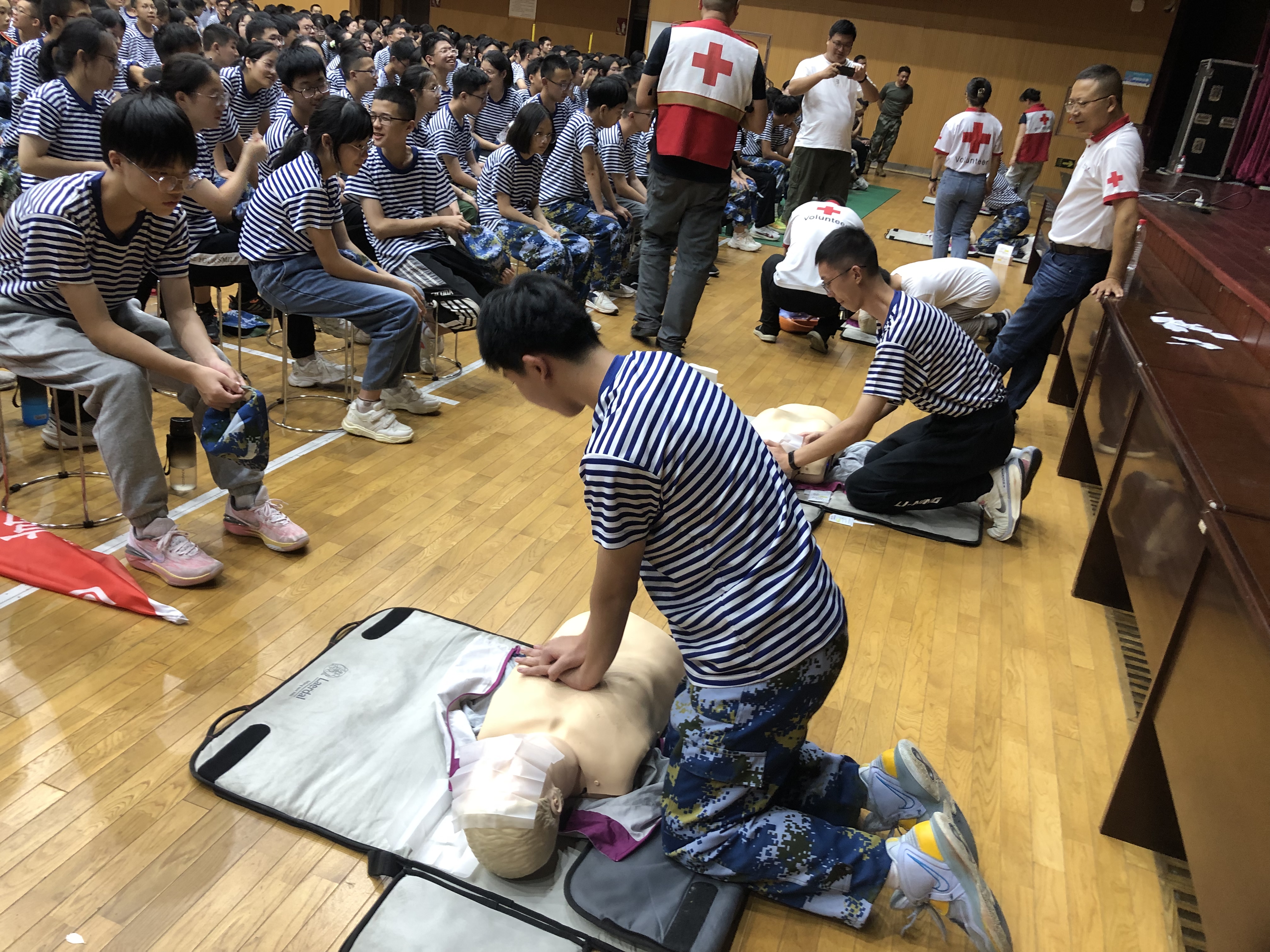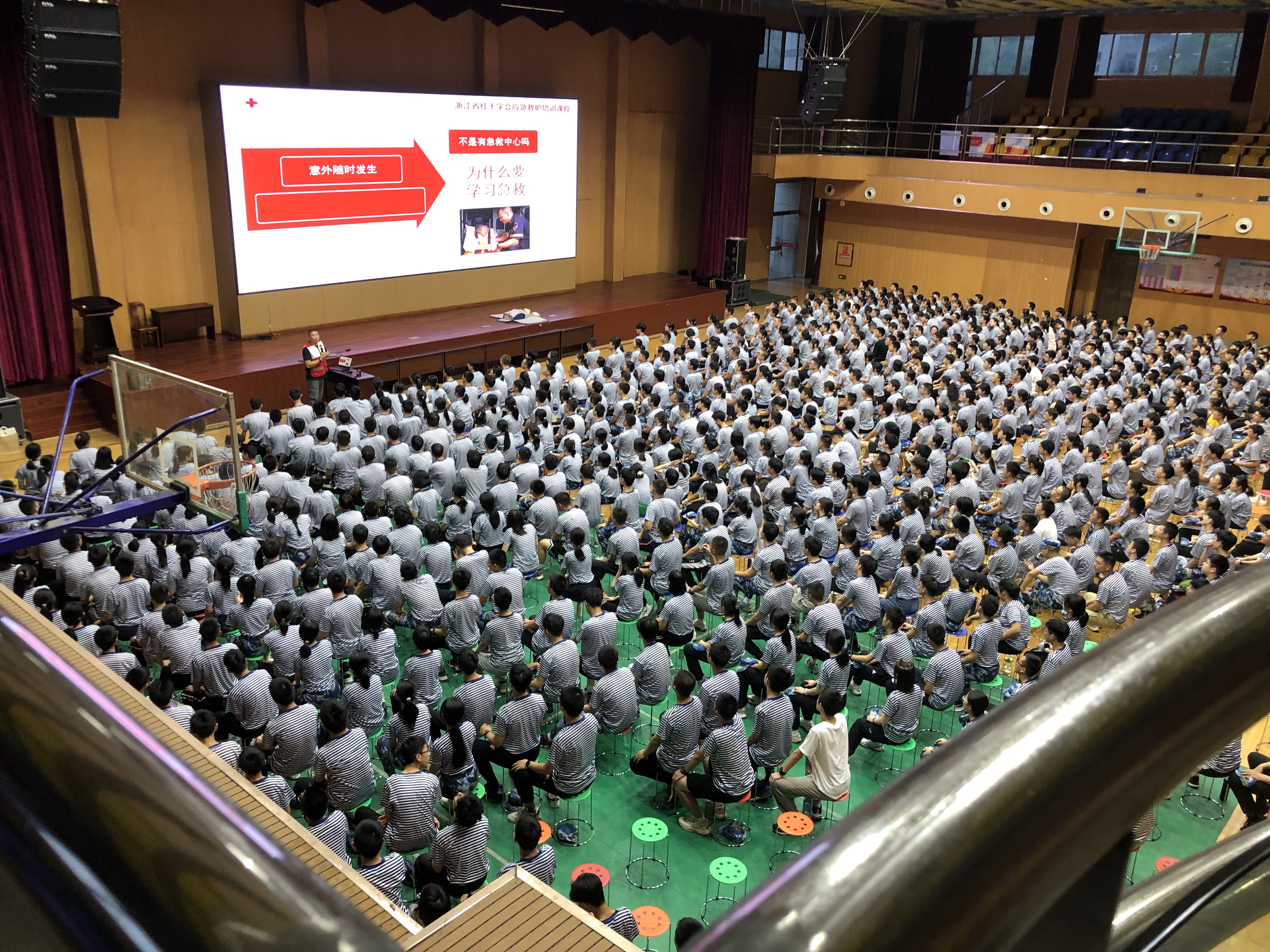 8月24日晚,紹興市柯橋區柯橋成人文化技術學校(柯橋街道紅十字應急救護培訓基地)在浙江省柯橋中學體育館開展紅十字應急救護普及培訓,720余名正在軍訓的高一年級新生參加培訓。