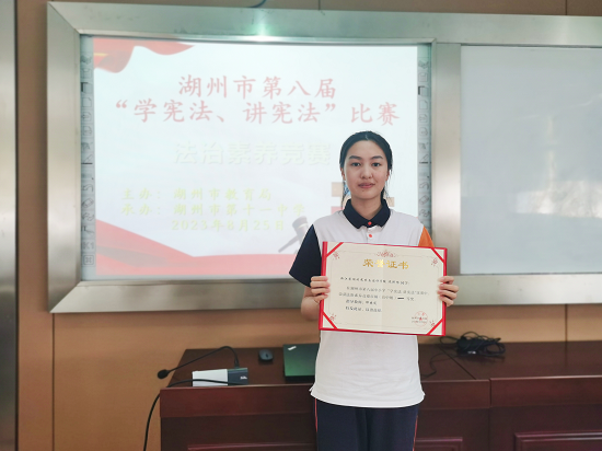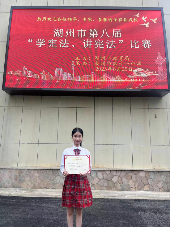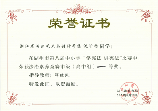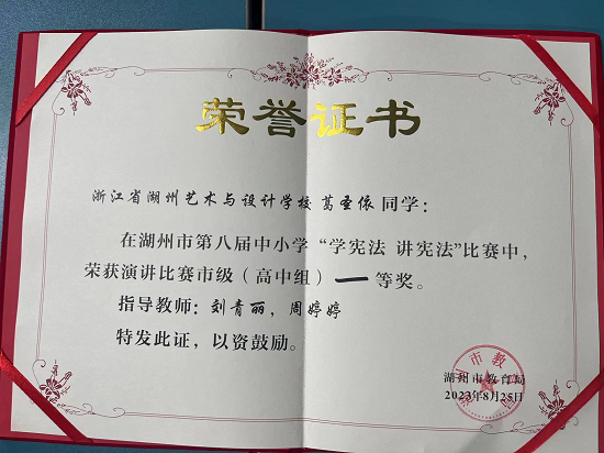 8月25日,由湖州市教育局主辦的2023年第八屆“學憲法 講憲法”比賽在湖州十一中舉行。浙江省湖州藝術與設計學校2104班葛圣依同學在演講比賽取得一等獎第一名的好成績,2204班沈昕怡同學在法制素養競賽中榮獲高中組一等獎。