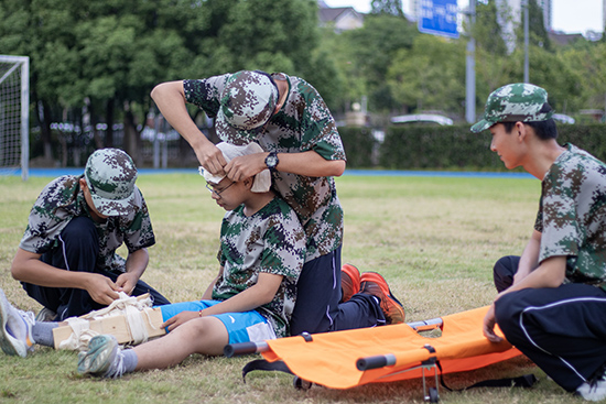 每排派出四名選手,分別擔任傷員、救護員、搬運員。救護員首先運用掌握的救護知識,包扎傷員,隨后,兩名搬運員將傷員抬上單架,最短時間內送往“救護點”。