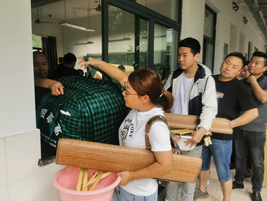 報到完成,高一新生和家長們有序排隊,領取生活用品,整個校園洋溢著熱烈、溫馨的氣氛。