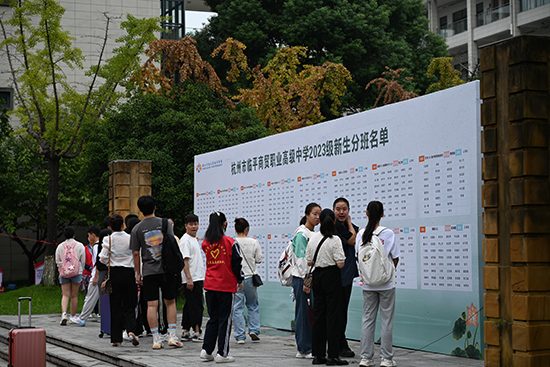 進入校園后,高一新生及家長在志愿者的引領下,查看分班情況,前往教學樓各班級教室報到、辦理手續。