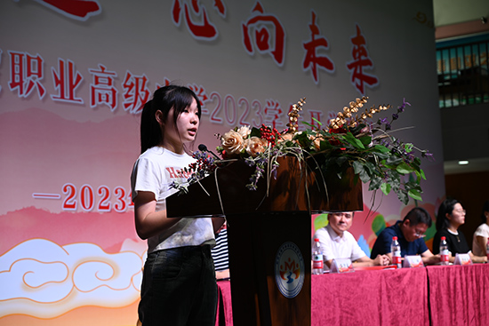 商助211班余婷同學發言。高職考的接力棒交到了新高三的手上,余婷同學代表全體高三學子給學弟學妹們分享了在校心得,并為即將到來的高考打氣加油。