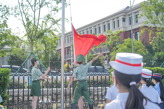 在莊嚴的國歌聲中,國旗護衛隊身著三色制服,邁著整齊的步伐,在全校師生的注視下,將五星紅旗升上藍天。