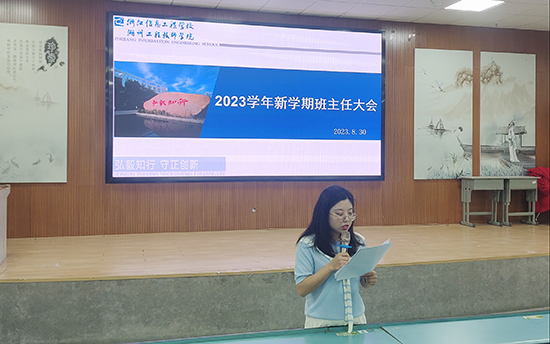 為明確新學期學校工作要求,強化常規管理,提高德育工作實效,保證新學期開學工作的有序開展,8月29日—8月30日,浙江信息工程學校·湖州工程技師學院在三號階梯教室分別召開了2023級新生班主任會議及新學期班主任會議。校黨委委員、副校長朱曉慧,學生處、督導處、招生就業處、后勤處等相關處室負責人,各專業部正副部長、助理、團總支書記、德育組長及全體班主任參會。會議由學生處處長楊育萍主持。