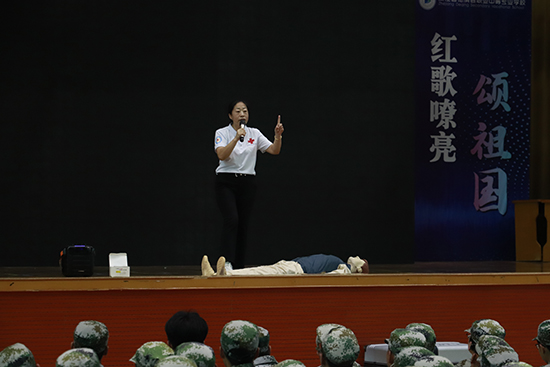 紅十字救護員老師們向同學們介紹了心搏驟停的表現,如何判斷是否喪失意識、有無自主呼吸、有無脈搏,幫助大家判斷應急救護的正確時機,并通過“模擬人”示范胸外按壓、清理口腔異物、開放氣道、人工呼吸等操作要領。講解示范后,學生代表上臺進行現場模擬救護的實操練習,老師們對同學們的操作手法進行了規范指導。