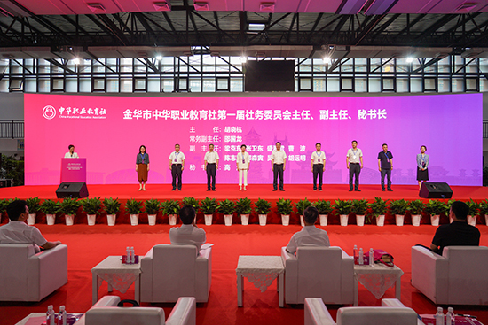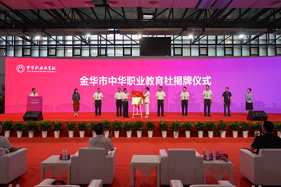 在全場熱烈的掌聲中,陳小平和胡曉杭共同為金華市中華職業(yè)教育社揭牌。